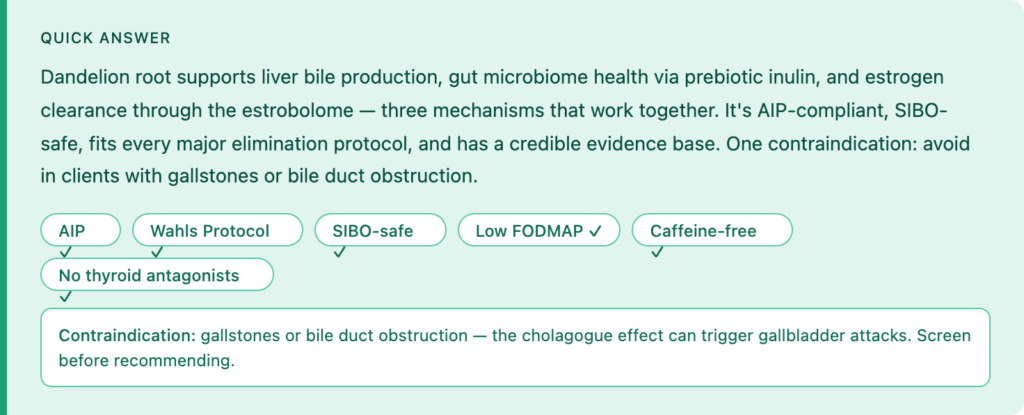 ONE CONTRAINDICATION TO KNOW Gallstones or bile duct obstruction are a contraindication. Dandelion root’s cholagogue effect — stimulating bile release — can trigger gallbladder attacks in clients with existing gallstones. Screen for this before recommending. Clients who’ve had their gallbladder removed are generally fine, but flag for individual assessment.