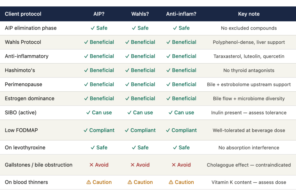 For AIP and Hashimoto’s clients: no thyroid antagonist compounds exist in dandelion root. No cross-reactivity with thyroid medications. The anti-inflammatory polyphenol profile is directly relevant to autoimmune load reduction.