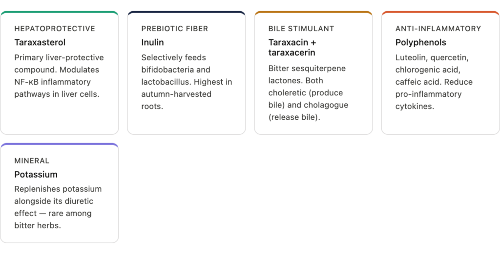 The bitter compounds — taraxacin and taraxacerin — have both choleretic (stimulates bile production) and cholagogue (stimulates bile release) effects. A 2025 narrative review in MDPI Pharmaceuticals confirmed that taraxasterol modulates inflammatory and oxidative stress pathways in liver cells, with preclinical studies showing protection against liver damage from alcohol, carbon tetrachloride, and paracetamol.