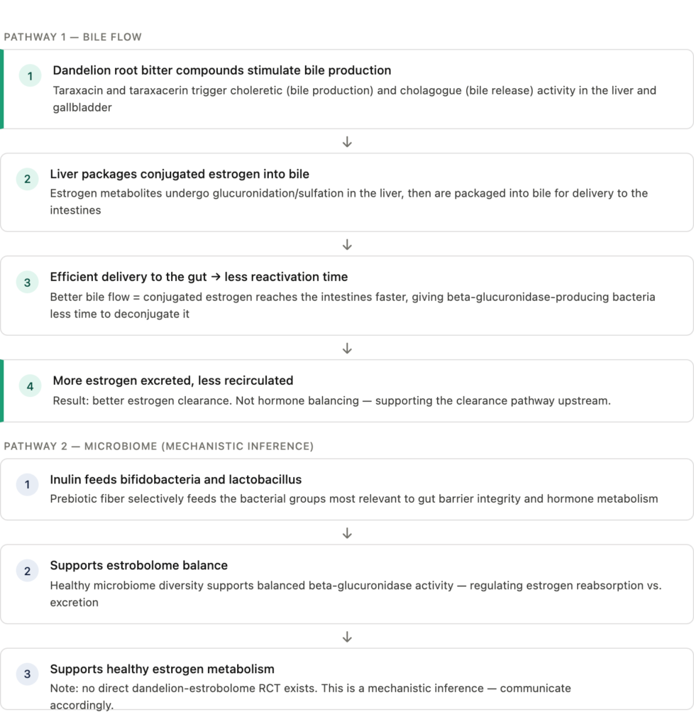 To be clear: there is no human RCT directly linking dandelion root to estrobolome outcomes. The mechanism is logical — inulin feeds the bacteria, the bacteria regulate the estrobolome. Communicate it as the mechanistic inference it is, not as proven direct effect.